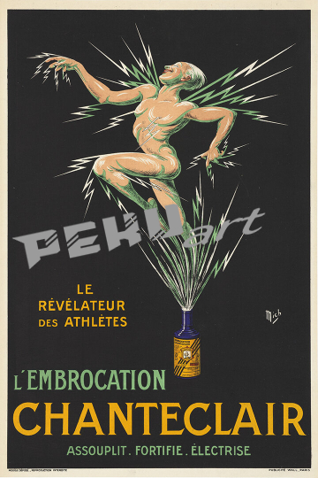 A naked athlete being electrified to show the effect of "Chanteclair" embrocation.